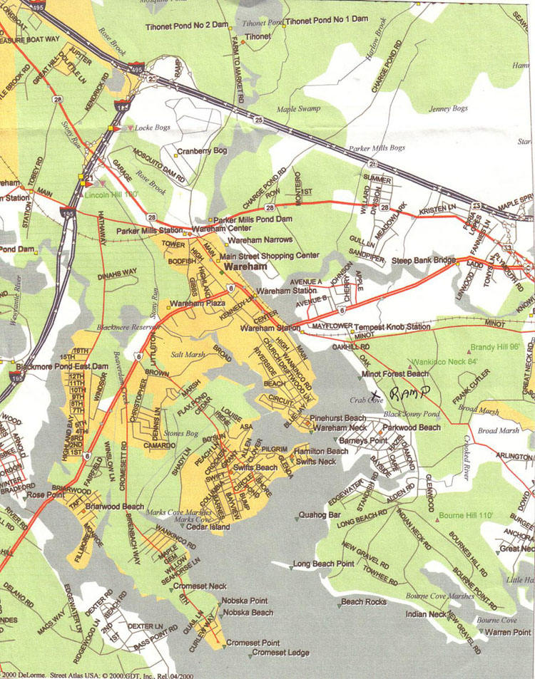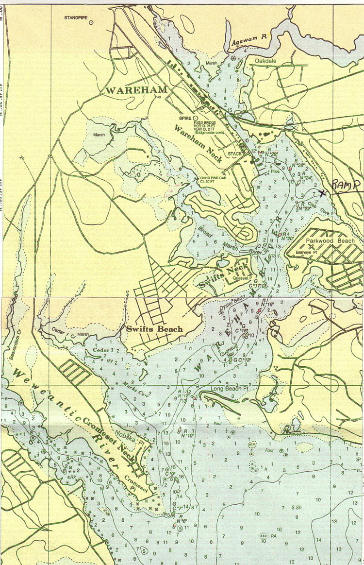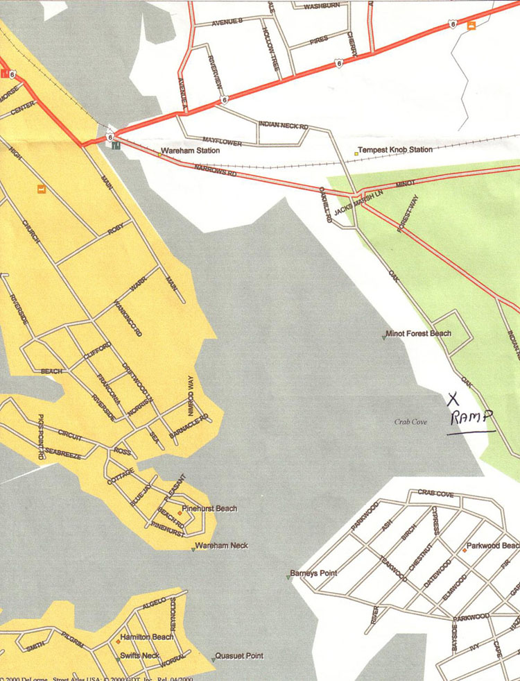 Ramp Details and Parking: The Tempest Knob Ramp is on Oak Street, Wareham. It is a very good double ramp with a large dock on the north side. The ramp is well protected and there is a $5 fee per day (not per 24 hours) (2010 rate, not confirmed for 2011) for using it or parking there and is payable at the ramp. (Bring exact change)